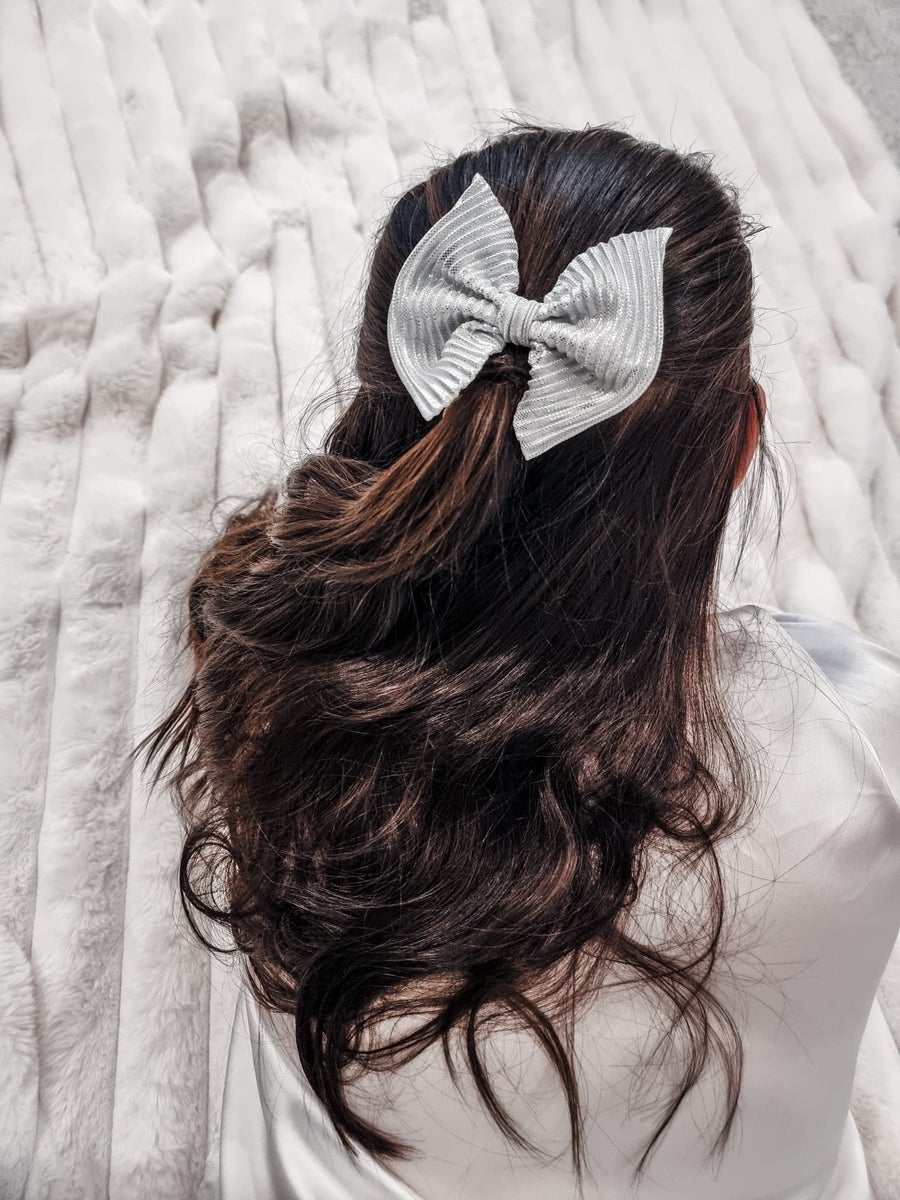 Kauniista hopean sävyisestä satiinipliseestä valmistettu rusettipanta tai - pinni.